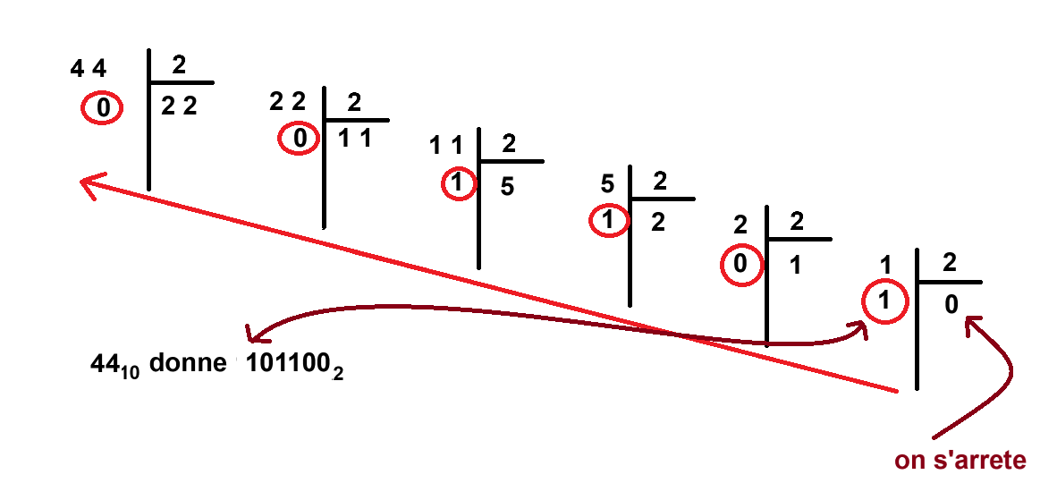 Conversion de \( 44_{10} \) en base \( 2 \) (binaire) :
