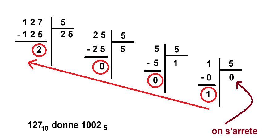 Exemple : Si on veut convertir 127 en base 5 cela donne