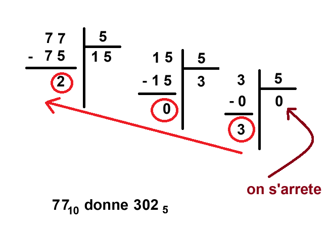Conversion de \( 77_{10} \) en base \( 5 \) :