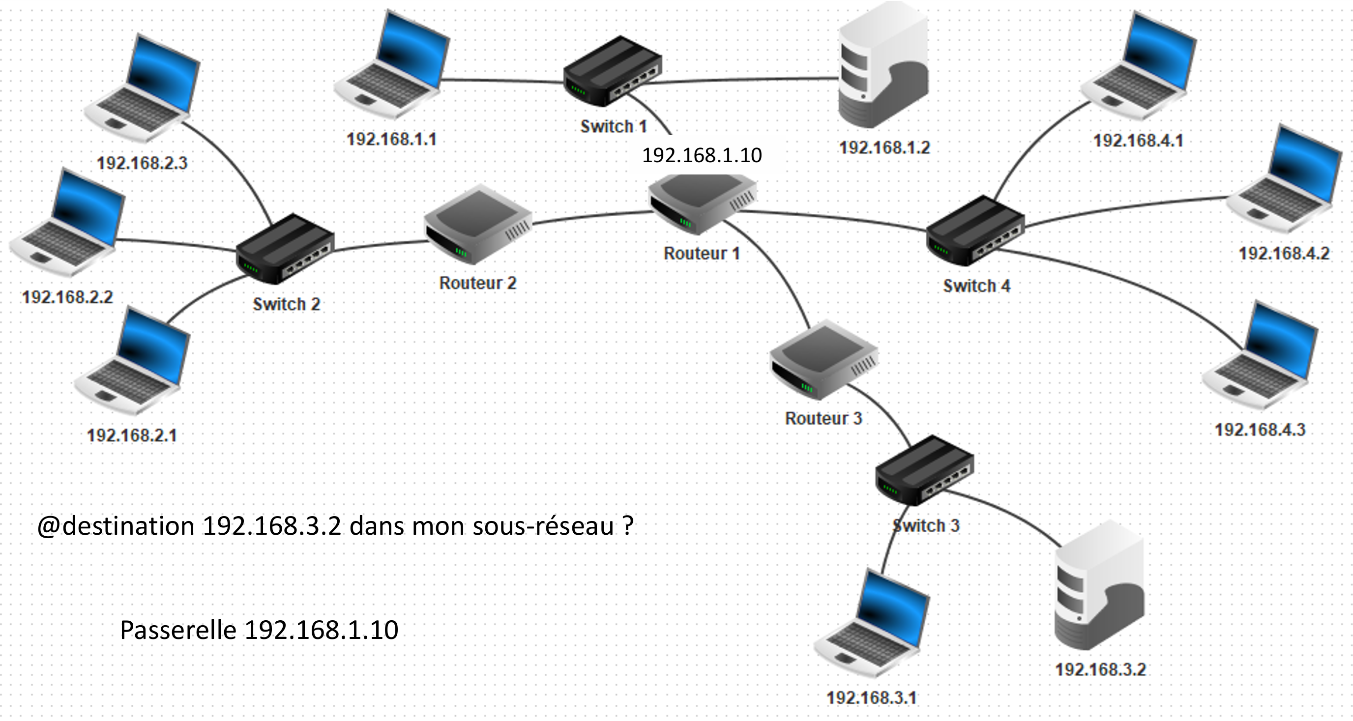 Ce réseau est composé de plusieurs sous-réseaux. On souhaite faire communiquer la machine M9 avec un autre ordinateur de son réseau local.