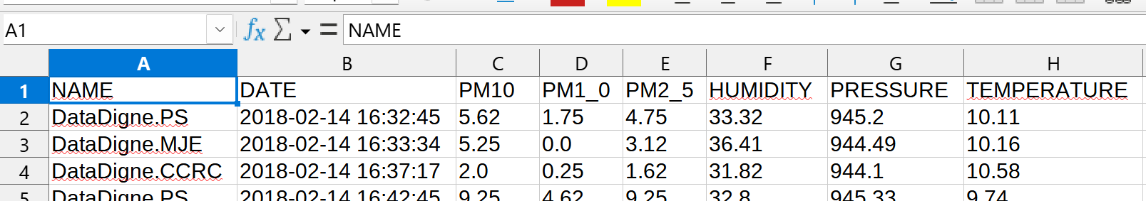 Le fichier fourni permet de connaître la concentration dans l’air des particules fines PM10, PM2.5 et PM1 ainsi que le taux d’humidité, la pression atmosphérique et la température sur une année. Le fichier est composé de 78 986 lignes. La mise à jour du fichier est annuelle, le fichier le plus récent remplace le précédent.