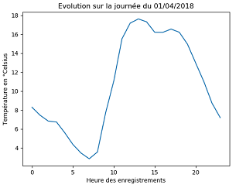On désire exploiter fichier des mesures 2018 fourni au format CSV. On souhaite en particulier voir l’évolution des mesures sur la journée choisie par l’utilisateur, conformément au graphe ci-contre. Pour cela on va décomposer le programme en fonctions élémentaires que l’on validera avant de passer à la suite.