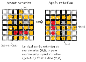 Rotation d'un quart de tour. Un pixel de coordonnées (x;y) dans une image de taille n×n a pour coordonnées avant rotation d'un quart de tour en sens horaire (y;n−1−x)