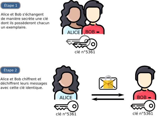 Dans un chiffrement symétrique, la même clé est utilisée pour chiffrer 🔒 et déchiffrer 🔓 le message.